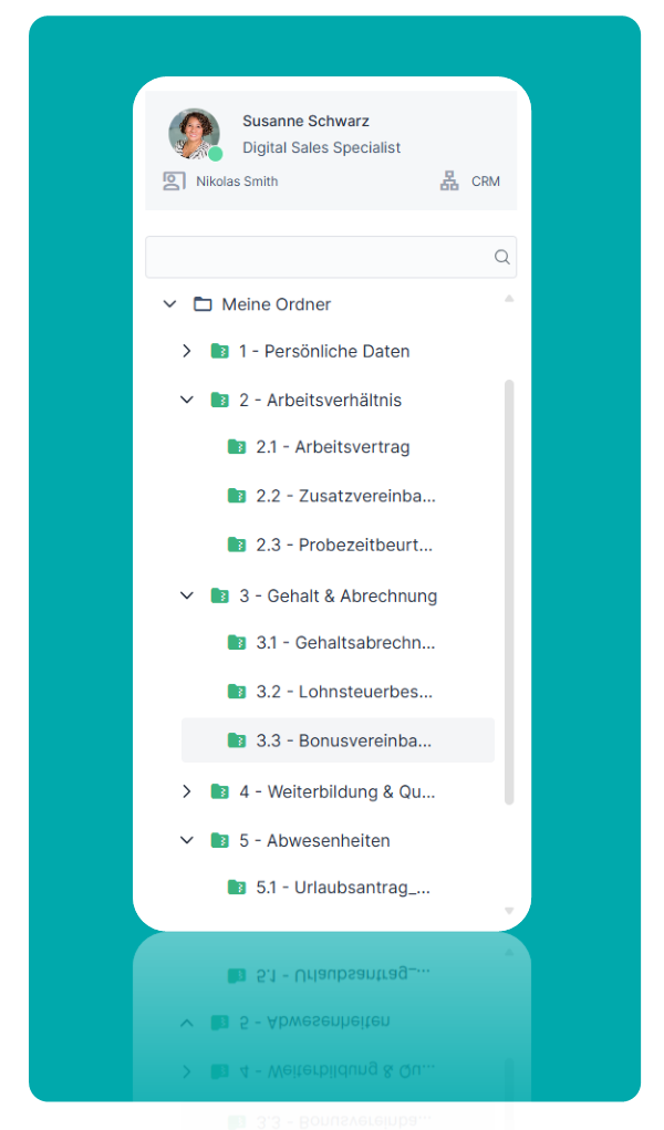 - Flexible Ordnerstrukturen: als Shared-Ordner für Teams oder Abteilungen sowie als individuelle Ordner für jeden Mitarbeiter.