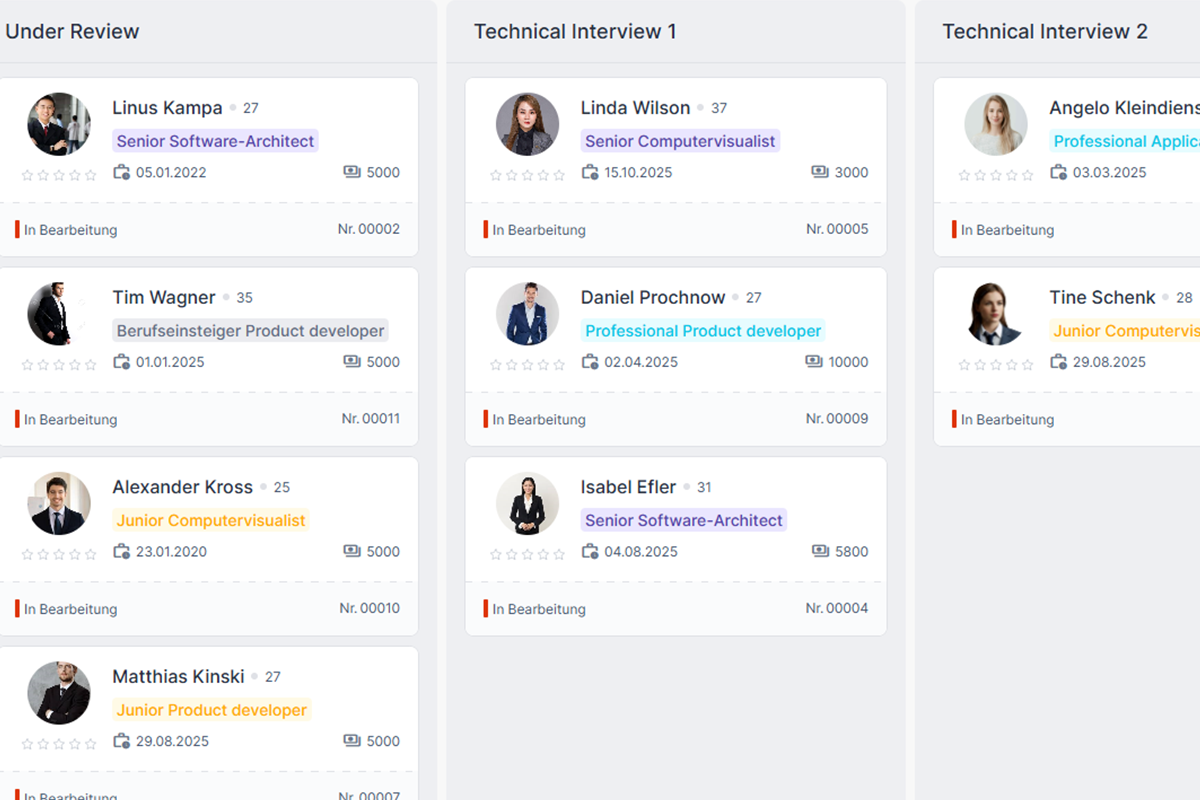 Mit den interaktiven Boards von KAN-ONE behalten Sie jederzeit den Überblick über Ihre Kandidaten. Jede Bewerbung wird als Karte dargestellt – inklusive Name, Rolle, Bewerbungsdatum und aktuellem Status. Die Karten lassen sich per Drag-and-Drop durch die einzelnen Phasen bewegen, sodass Sie den Fortschritt visuell und intuitiv steuern können.