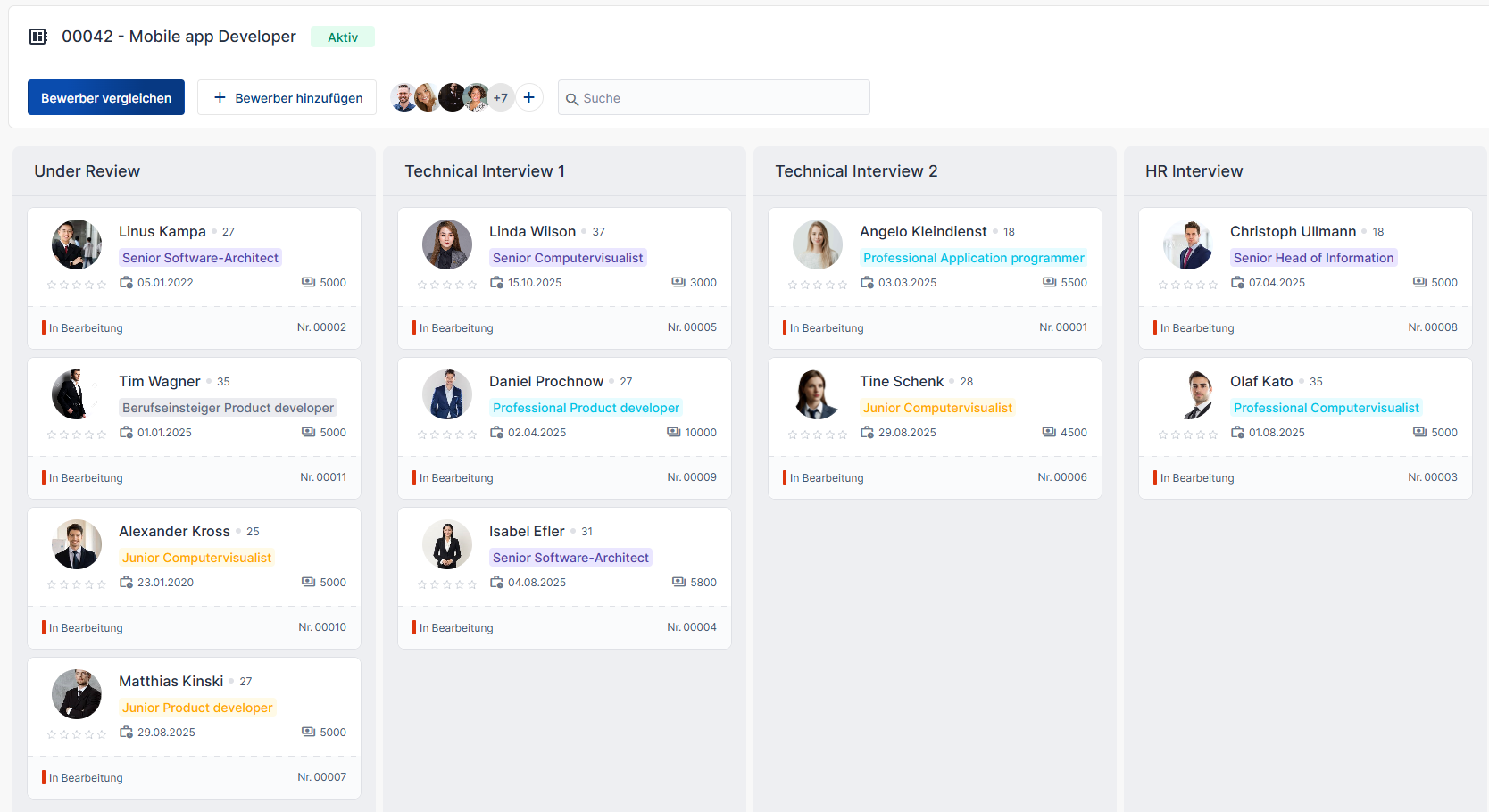 Mit den interaktiven Boards von KAN-ONE behalten Sie jederzeit den Überblick über Ihre Kandidaten. Jede Bewerbung wird als Karte dargestellt – inklusive Name, Rolle, Bewerbungsdatum und aktuellem Status. Die Karten lassen sich per Drag-and-Drop durch die einzelnen Phasen bewegen, sodass Sie den Fortschritt visuell und intuitiv steuern können.