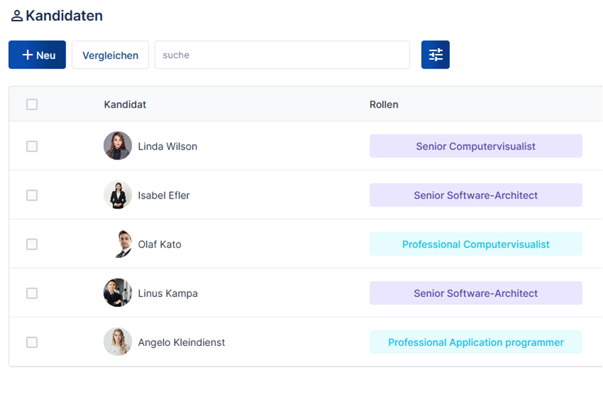 Der Screenshot zeigt eine zentralisierte, strukturierte Kandidatendatenbank in Listenform mit Namen und deren Rollen.